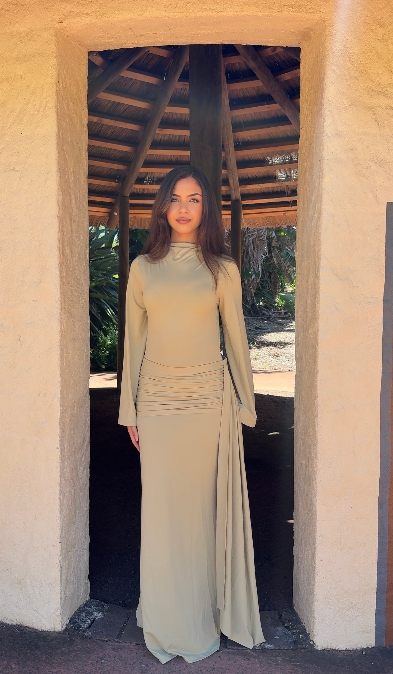 A refined statement piece designed for modern elegance. This ÉLAN Draped maxi dress features a streamlined silhouette with a high neckline and long flared sleeves. Crafted from a smooth, stretch fabric, the dress provides a comfortable yet sculpted fit. The ÉLAN maxi has Subtle ruching at the waist and hip creates a flattering drape that enhances the natural shape.