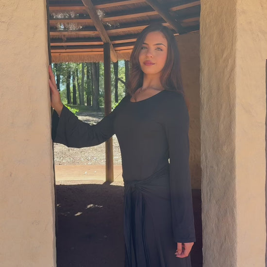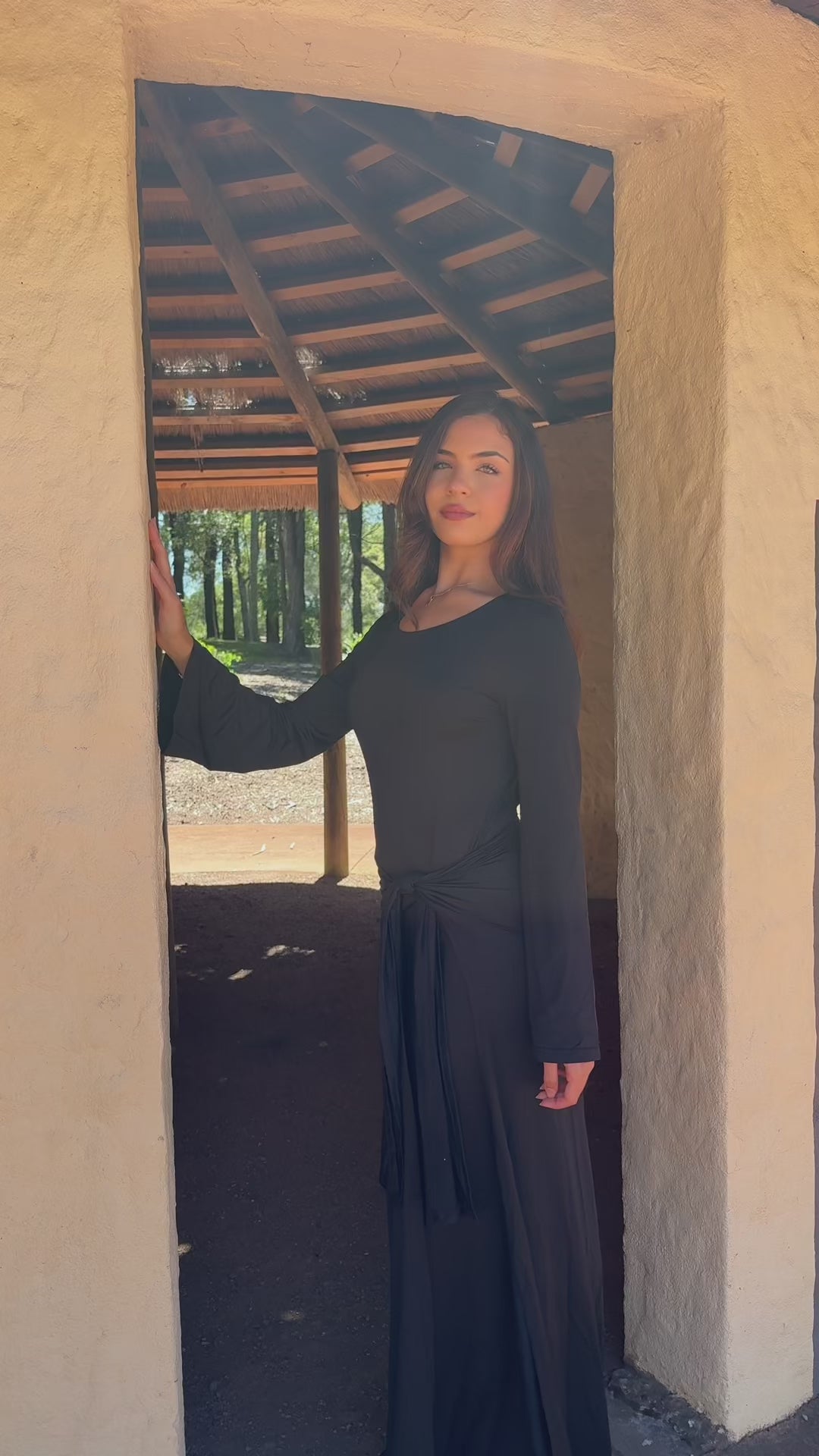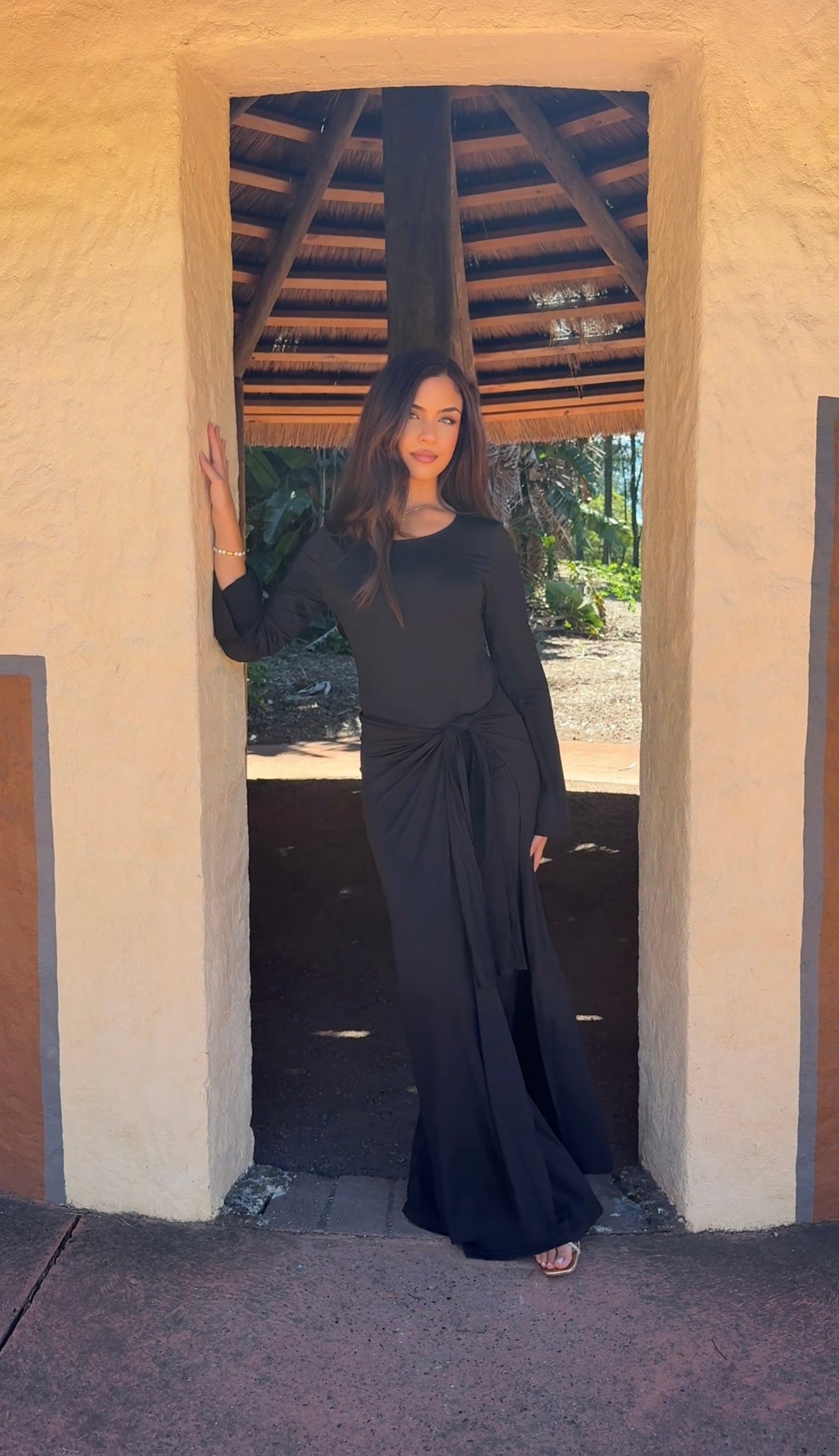 ÉSLA The perfect resort wear essential, this timeless black maxi dress is designed for effortless elegance. Crafted from a soft, fluid fabric, it drapes beautifully over the body for a flattering, elongated silhouette. Featuring a classic round neckline and long, relaxed sleeves, it offers refined comfort in warm-weather settings.