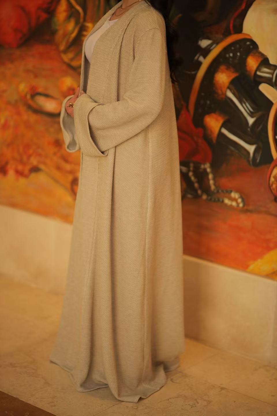 • Longline Jacket: Designed for a generous, relaxed fit, this open-front piece features wide sleeves and turned cuffs. It drapes effortlessly and layers easily — no need to size up.