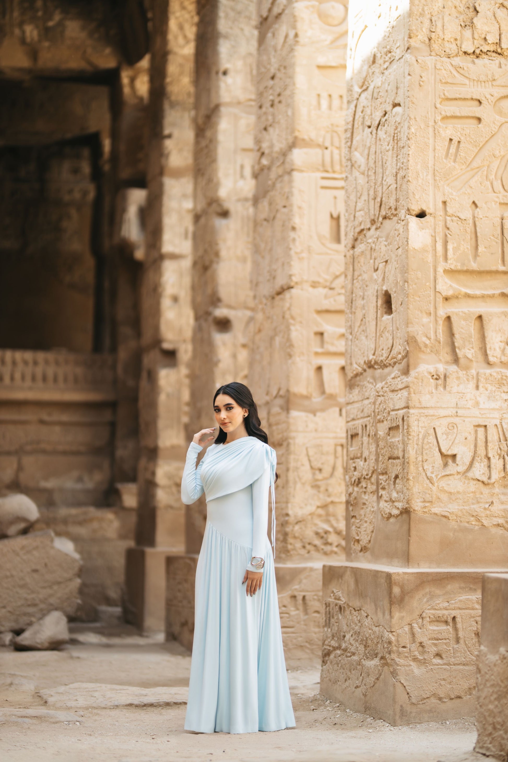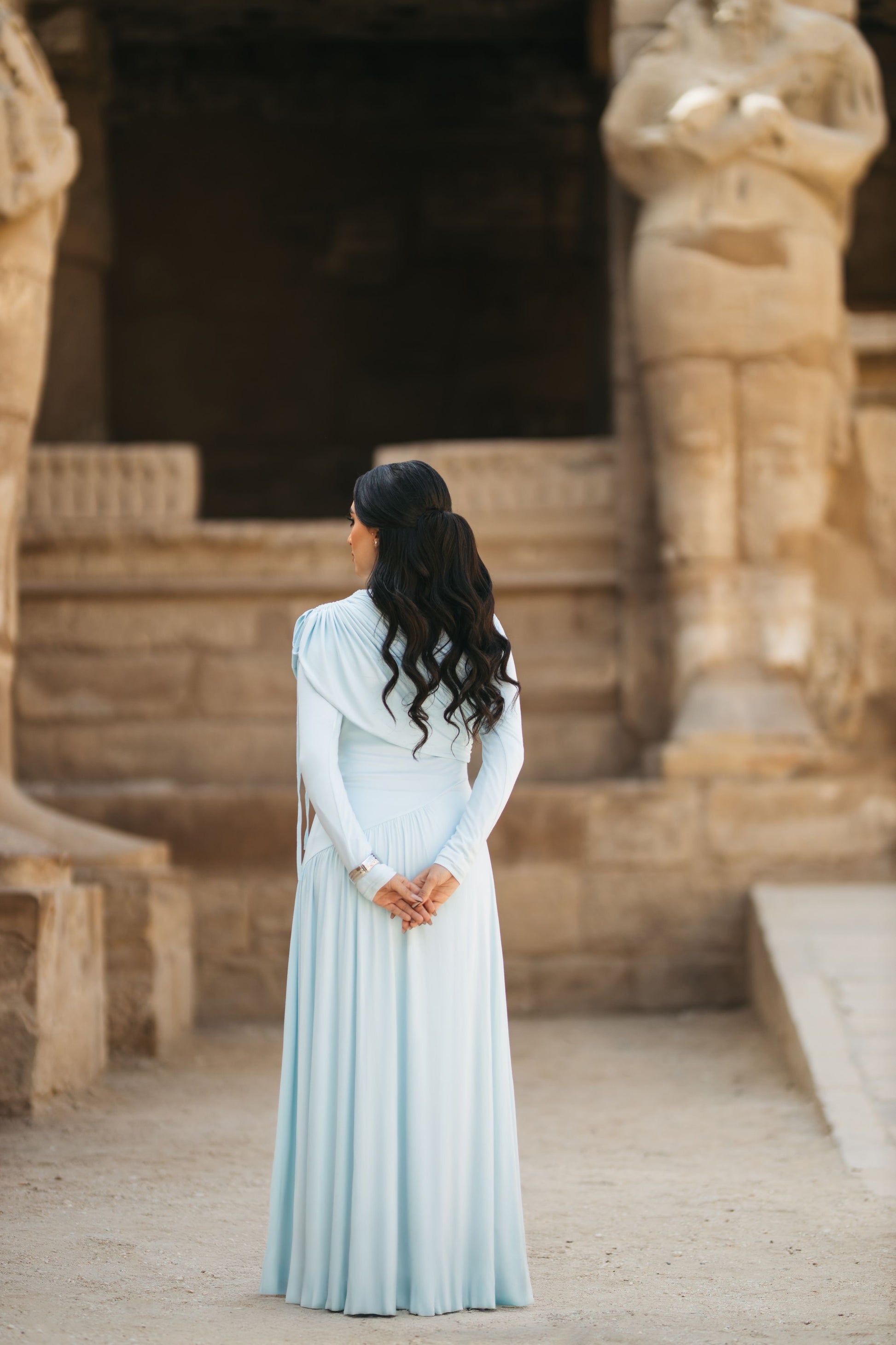 Step into timeless sophistication with the Lilia Dress, a flowing floor-length dress designed to flatter. Crafted in a soft blue hue, this dress combines modern elegance with subtle statement details.