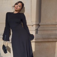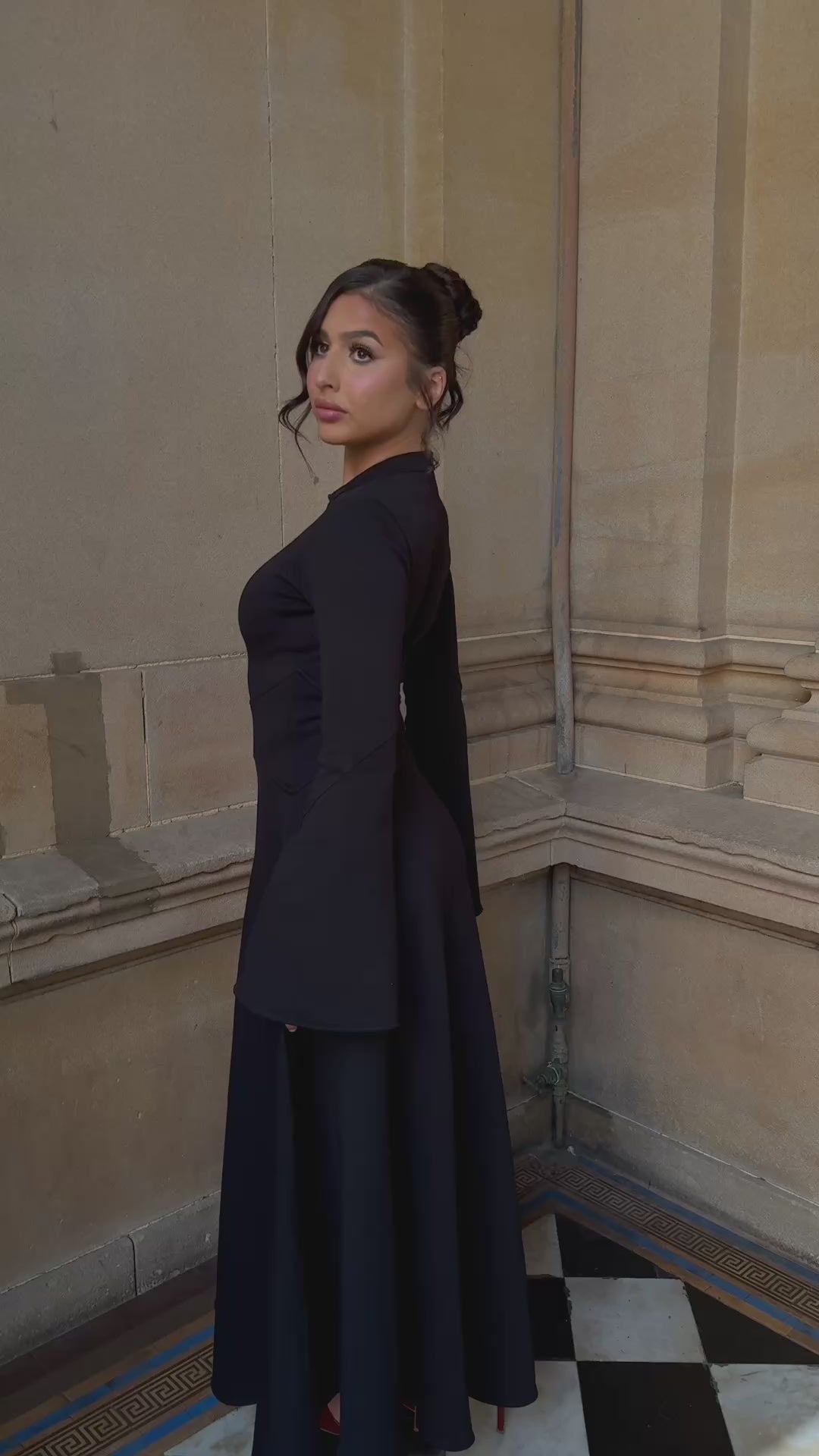 Sculptural elegance takes center stage with LUNA NOIR, a modern black maxi dress designed to flatter and define. Featuring a high neckline and a close-fitting bodice, it flows into a softly flared skirt that moves with ease. The cinched waist and expertly tailored seams create the illusion of a curvier figure, enhancing your natural silhouette. Tonal button details accent the dramatic bell sleeves, adding a refined edge to this minimalist design.