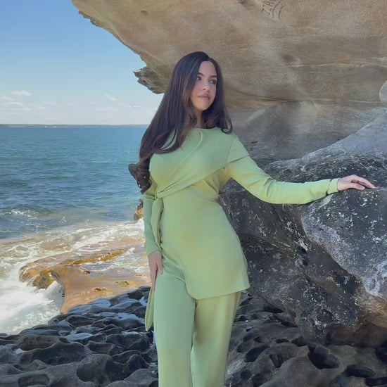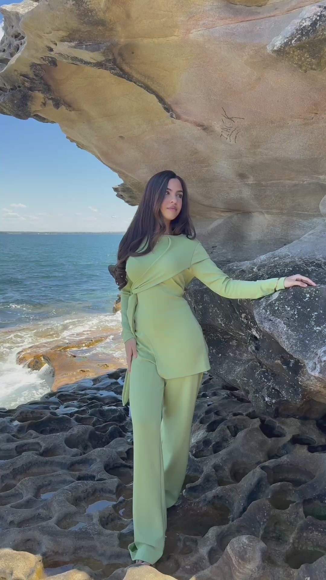 Elevate your wardrobe with the Selia Set, a sleek and modern two-piece ensemble designed for everyday comfort. Crafted from a premium stretch fabric, this set features a long-sleeve asymmetrical top with a flattering wrap detail and side tie, paired with wide-leg trousers that offer both comfort and style.
