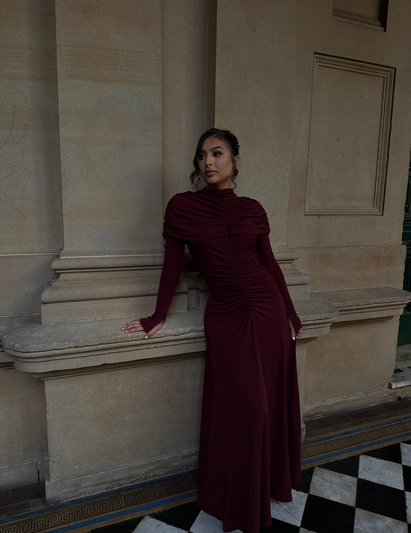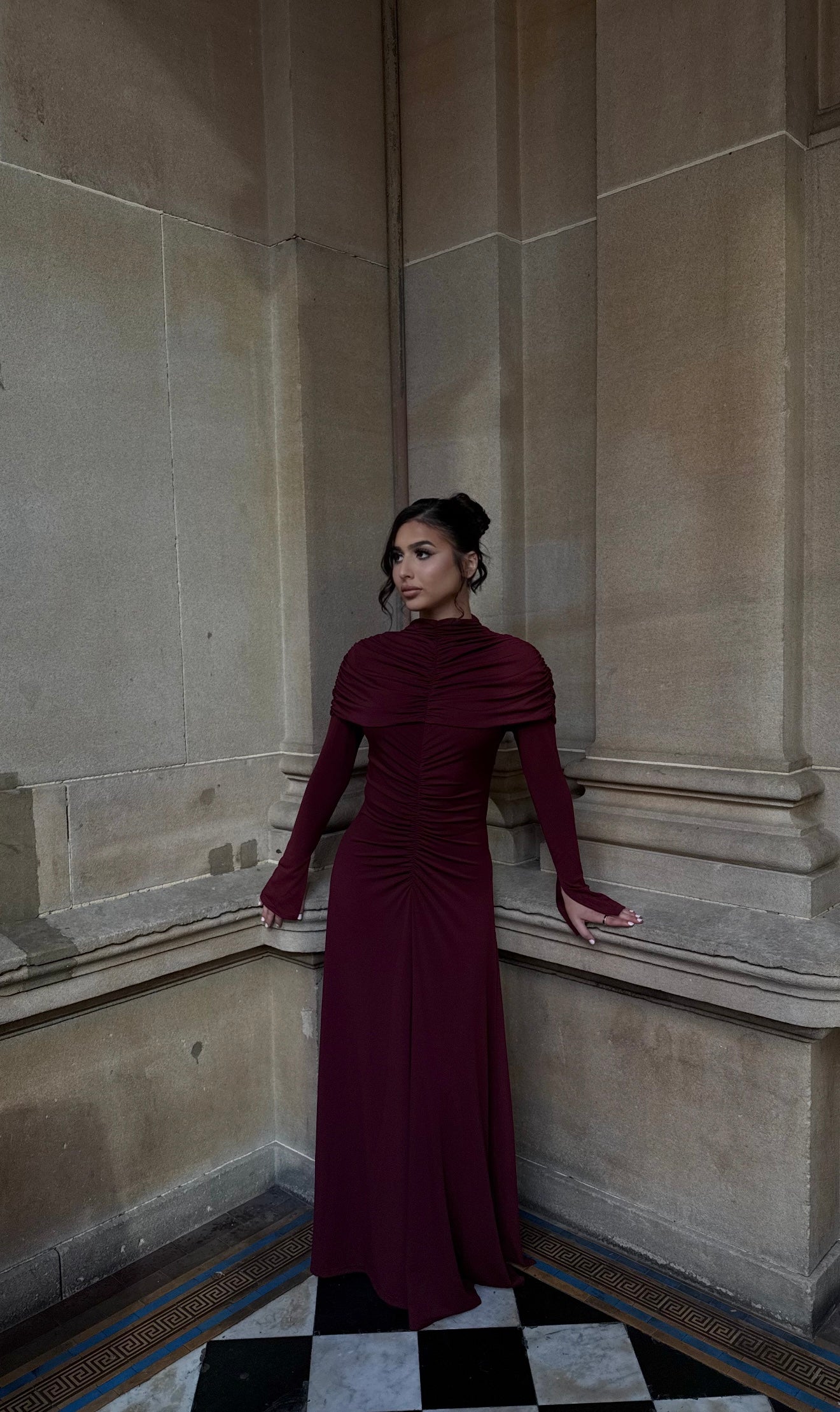 Introducing ZEPHIRA IN MARON. ZEPHIRA is a figure-flattering maxi dress designed for a special event. Crafted from lightweight, stretchy fabric, it features all-over ruching to contour the body and enhance your natural shape. The dress fits close through the frame and finishes with a softly pleated hem that adds graceful movement.